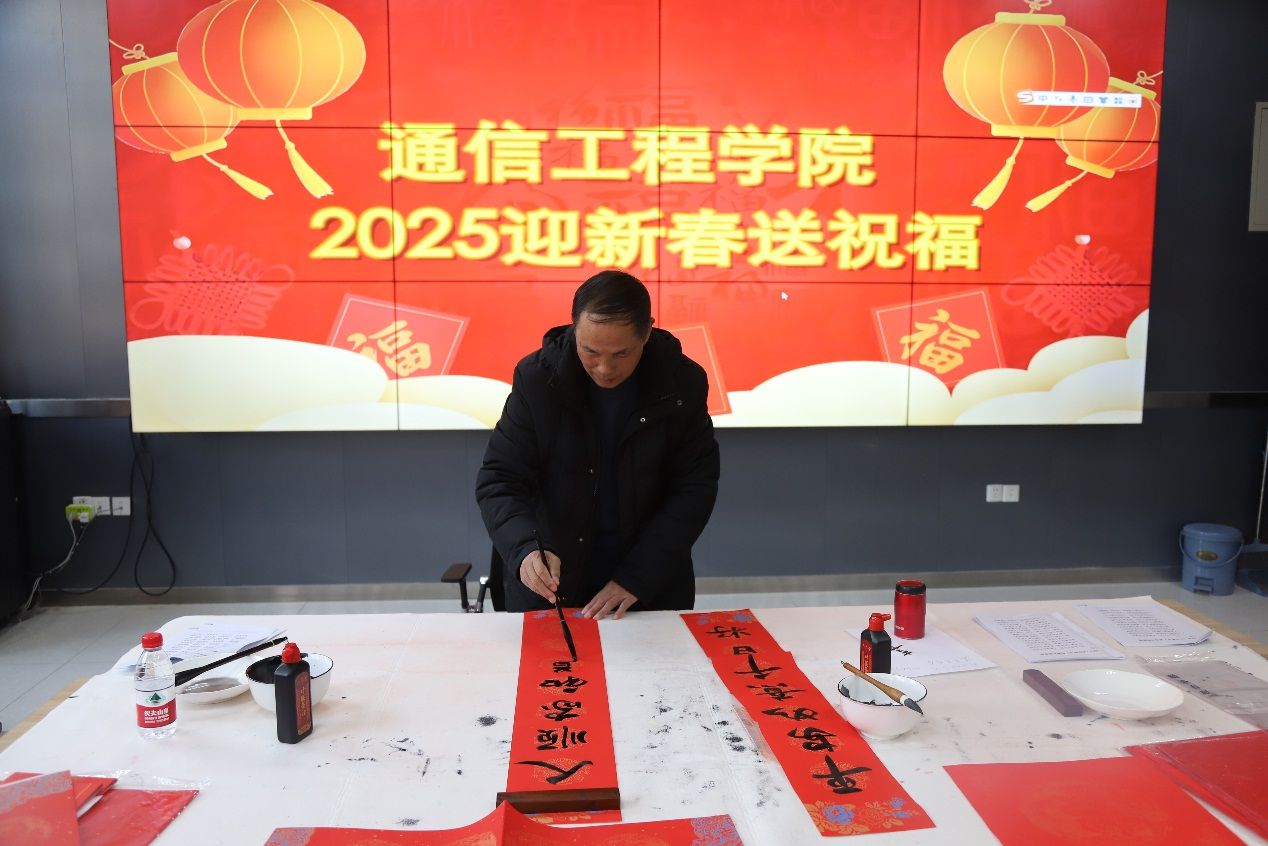 活动在十大外围足球平台app工会精心布置的主楼2区219拉开帷幕,现场红纸铺开,墨香四溢,充满了节日的喜庆气氛。本次活动特别邀请通院退休职工、陕西省书法协会会员姚正琪老师。姚老师精神矍铄,手持毛笔,在一张张鲜红的宣纸上挥洒自如,笔走龙蛇间,一副副寓意吉祥、祝福满满的春联跃然纸上,赢得了在场教职工的阵阵掌声和赞叹。