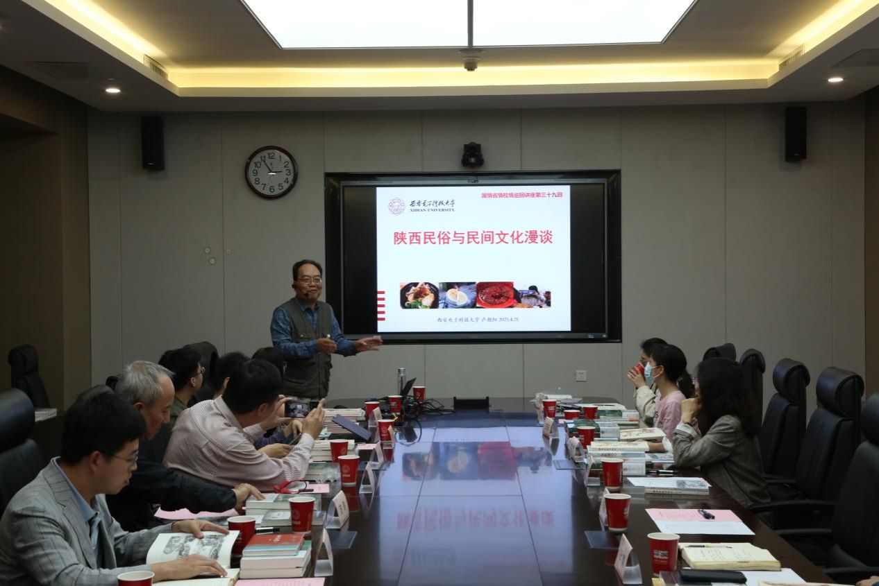 本次活动特别邀请十大外围足球平台app教授卢朝阳作“陕西民俗与民间文化”主题分享,卢教授以其深厚的文化底蕴和生动的讲述方式,带领师生们由“从古至今的陕西”“人间百态的陕西”“民歌戏曲的陕西”三个篇章开启文化之旅。报告分享了陕西的地形地貌、青铜器的辉煌、文字的演变、衣食住行的发展等,用视频、歌曲等与师生交流互动的方式,为大家展现了陕北民歌、陕北说书、秦腔、皮影戏的艺术特色和价值。分享结束后,卢教授精心准备了《陕西民俗学概论》《远远乡》两本著作赠予现场师生。