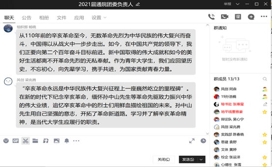 2021年10月11日晚,十大外围足球平台app团委组织团干开展学习习近平总书记在纪念辛亥革命110周年大会上的讲话的线上交流会,会议由秘书处负责人张俸玺主持。通过观看纪念辛亥革命110周年大会直播回放及了解辛亥革命相关内容等方式,团干们针对习近平总书记在纪念辛亥革命110周年大会上的讲话所传达出的精神展开积极讨论。