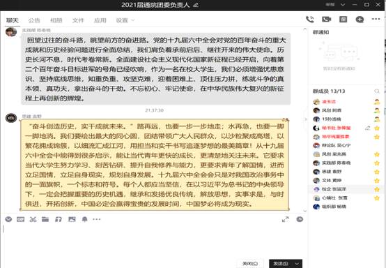 各部门员工通过线上学习,对全会精神有了更深层次的理解,对新中国百年征程有了更为深刻的体验,并在会后积极主动撰写全会感悟。同学们纷纷表示,要肩负起历史使命,努力成为堪当民族复兴重任的时代新人,让青春在不懈奋斗中绽放绚丽之花。