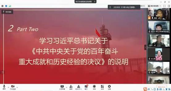 本次学习由薛喆同志主持。会议伊始,通信工程公司党员突击队队长白延军老师说明此次学习的重点与意义。他强调虽然线上学习的形式稍显简单,但希望同志们认真对待组织生活,保持“团结紧张,严肃活泼”的传统,结合抗“疫”的所见所闻、所思所行,更深入地理解十九届六中全会精神。随后薛喆同志引导大家学习十九届六中全会通过的《中共中央关于党的百年奋斗重大成就和历史经验的决议》以及习近平总书记对此的说明。通过学习两份重要文件,同志们对六中全会议题的必要性逻辑上更加贯通,对党的百年奋斗重大成就情感上更加崇敬,对党的百年奋斗历史经验认识上更加深刻。回顾历史,是为了展望未来,认清现实,从中汲取智慧与力量,更加勇毅地前行。同志们对自己身为青年,重任在肩的历史使命有了更深厚的体会。