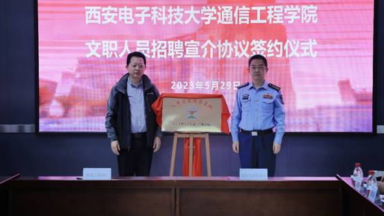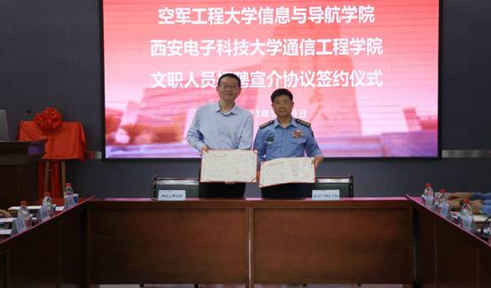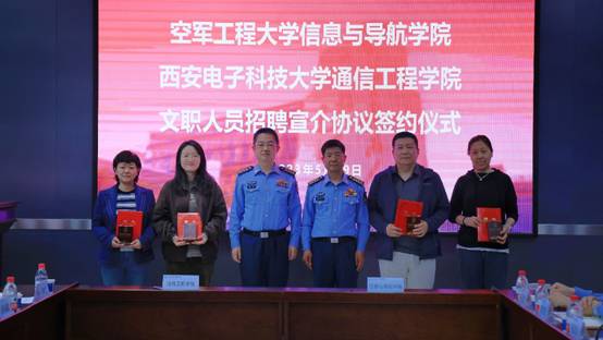 (通讯员 童宣)5月29日上午,十大外围足球平台app与空军工程大学信息与导航公司在北校区主楼219会议室举行文职人员招聘宣介协议签约仪式。通公司党委书记魏峻、执行经理李云松,空工大信院经理魏军、党委书记高修尧出席签约仪式。会议由空工大信院政治工作处主任张战兵主持。