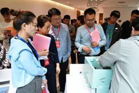 各位专家评委们认真听取了各小组的成果介绍,并就产品的设计理念、创新点以及市场方面的性价比、营销点等问题进行提问。现场互动气氛浓郁,展演同学积极向在场专家对作品进行展示,并邀请老师亲身体验自己的作品。