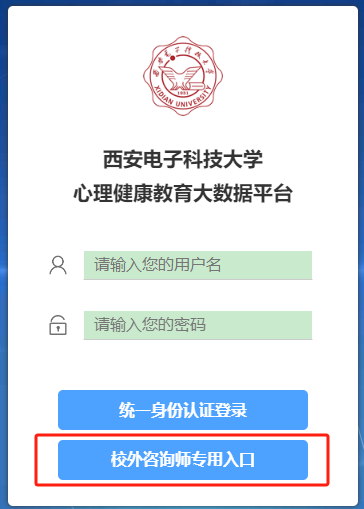 员工登录时,直接输入用户名及密码后,选择“校外咨询师专用入口”。用户名是考生准考证编号,密码为身份证后6位,如最后一位是字母,请用数字“9”代替字母。