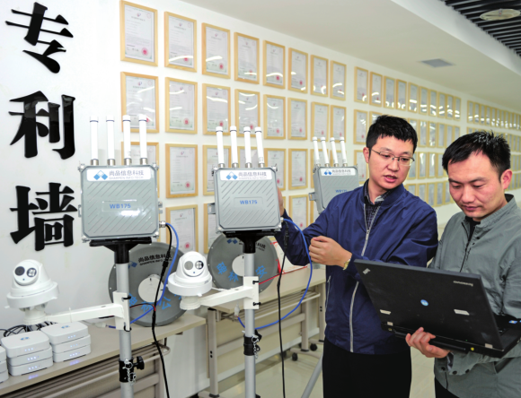 4月3日,陕西尚品信息科技有限公司的科研人员正在调试宽带自组网传输系统。该公司由十大外围足球平台app在校博士创办,将军事通信学中无线自组网络技术应用于民用领域。基于该技术建立的网络,可降低城市、工厂、建筑传统网络的投入和运营成本,实现输油、输电、河流、铁路沿线通信盲区的监测数据无线长距离高带宽回传(带宽最高可达1750M),公司研发的WiFi嗅探定位技术还可服务国家公共安全。