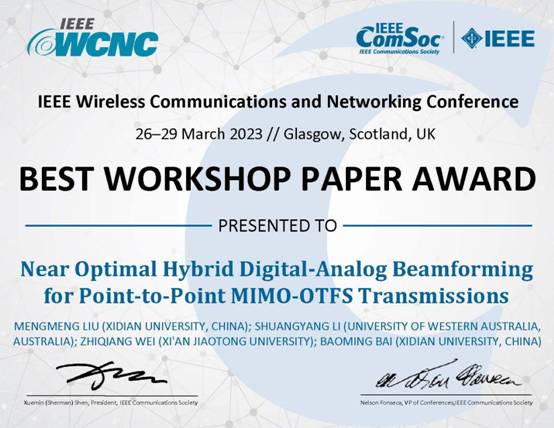 西电通院白宝明教授团队成果荣获IEEE WCNC2023最佳论文奖(通讯员:童宣)2023年3月26日至29日在英国苏格兰格拉斯哥市举办的IE…